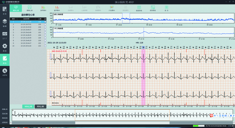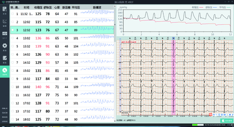 血压、心电联动分析。血压数据列表、脉搏波与心电图片段同屏互动