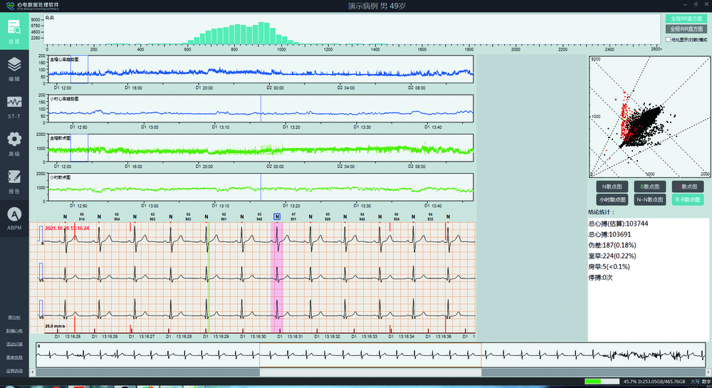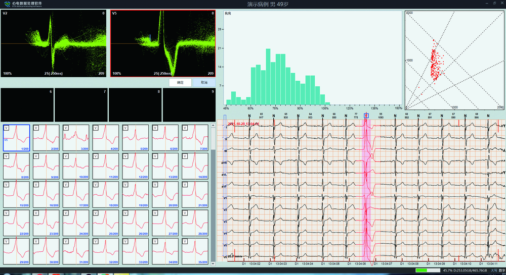 将直方图、心率趋势图、时间散点图和可编辑散点图同屏显示,患者情况一目了然