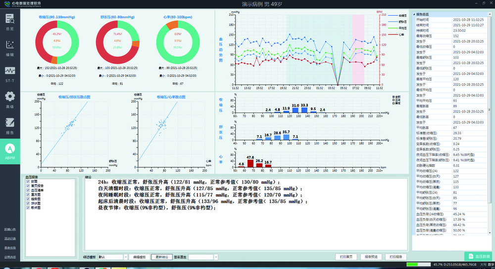 血压报告编辑界面数据详实、图表清晰,自动结论快捷方便