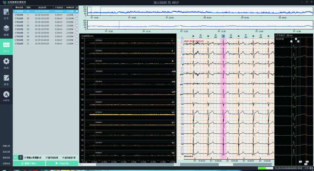 心率趋势图、12导同步心电图、叠加图三位一体同步显示ST-T变化